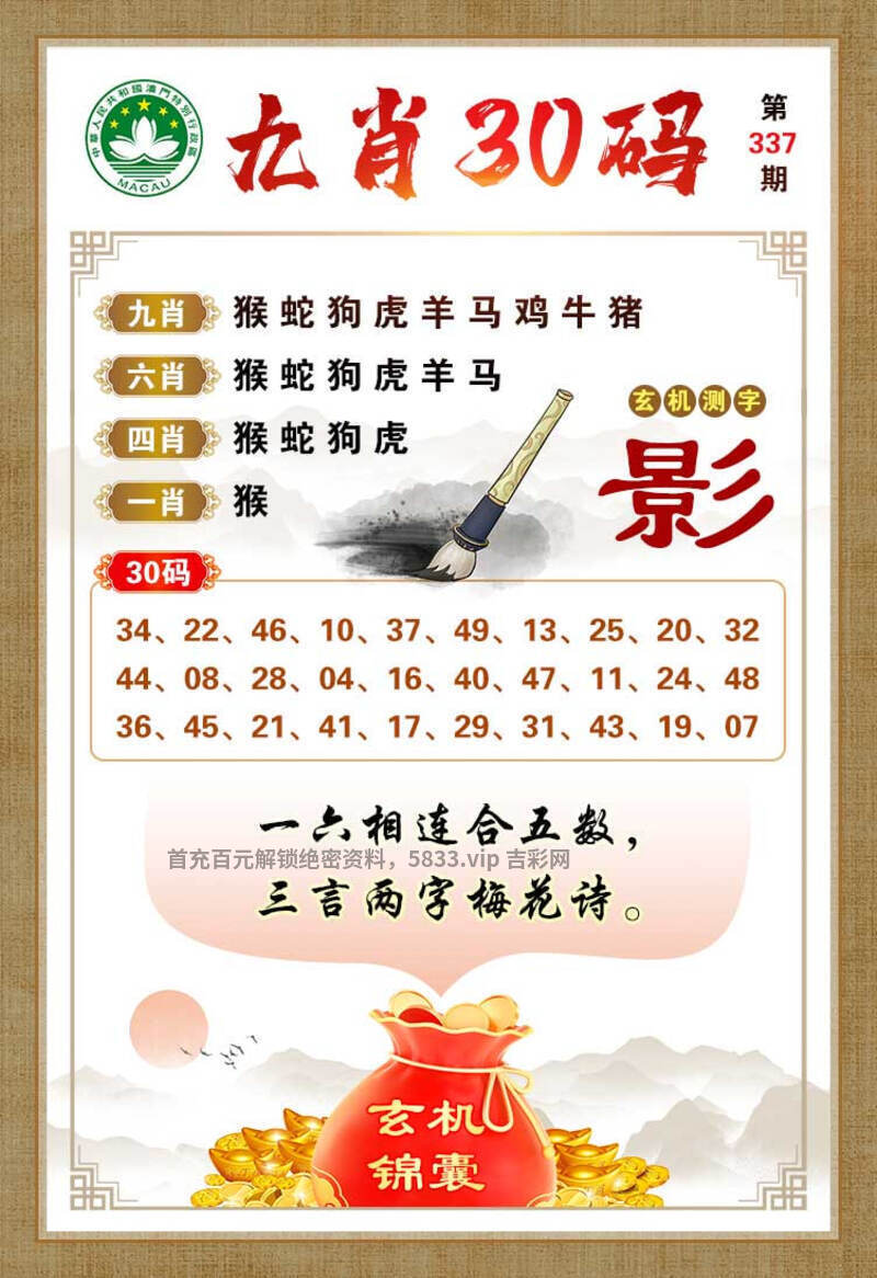 | 337期:七肖 | 鸡兔猪蛇虎猴狗 | 开:鸡09 |